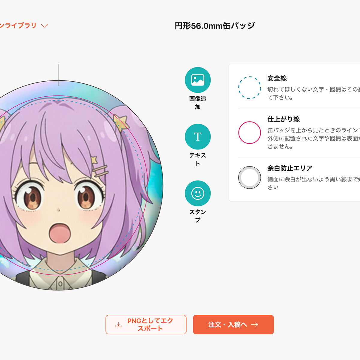 ご入稿いただいたデータをもとに、実際の缶バッジの仕上がりイメージを画面上でご確認いただけます。ご希望のサイズや形状に合わせて、最適なデータ作成を心がけましょう。